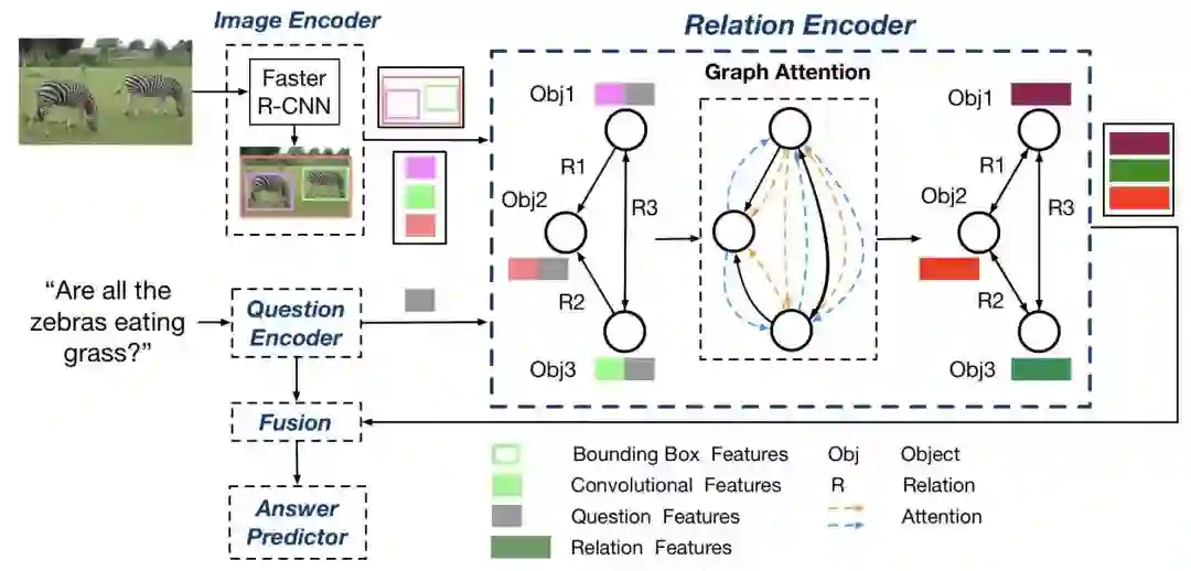 在上图中,视觉模型的作用是提取给定图像中的语义区域,这些语义区域与问题一并当做图中的节点,送到一个 GNN 模型中进行推理学习,这样的一种建模方式,可以更加有效地在视觉问答中对问题进行自适应地推理。