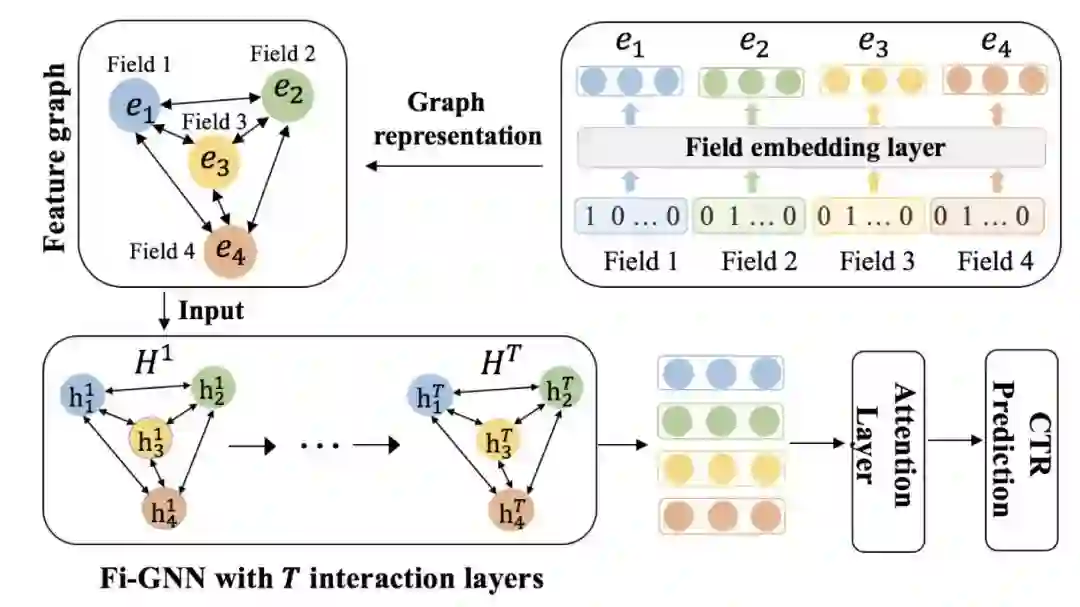 另外一个十分重要的、也与推荐系统息息相关相关的业务场景是广告点击率(CTR)预测。该场景下的样本通常是由多领域的特征数据构成,比如用户域、设备域、广告域等等,如何建模这些数据域之间的特征交互,成为了该任务的核心。最近基于神经网络的方法都是直接将各个域之间的特征拼接起来然后送到上层的网络模型中,以期得到这些域之间的高阶交互,这种简单的非结构化的拼接方式,会大大限制模型的学习能力。在“Fi-GNN: Modeling Feature Interactions via Graph Neural Networks for CTR Prediction”一文中,作者将各个域之间以图的形式连接起来(下图中的 Feature graph),然后用 GNN 建模各个特征域之间高阶复杂的交互关系,相比之前的模型取得了最好效果。