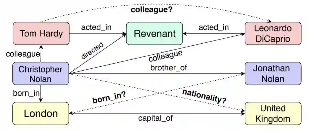 由于知识图谱本身就是一种图数据,因此知识图谱 +GNN 的组合自然就成了解决各类知识图谱问题的新手段。关系补全或预测问题是知识图谱的一大基础任务,通过关系的推理补全可以大大提升知识图谱的应用质量,下图给出了关系补全的一个实例: