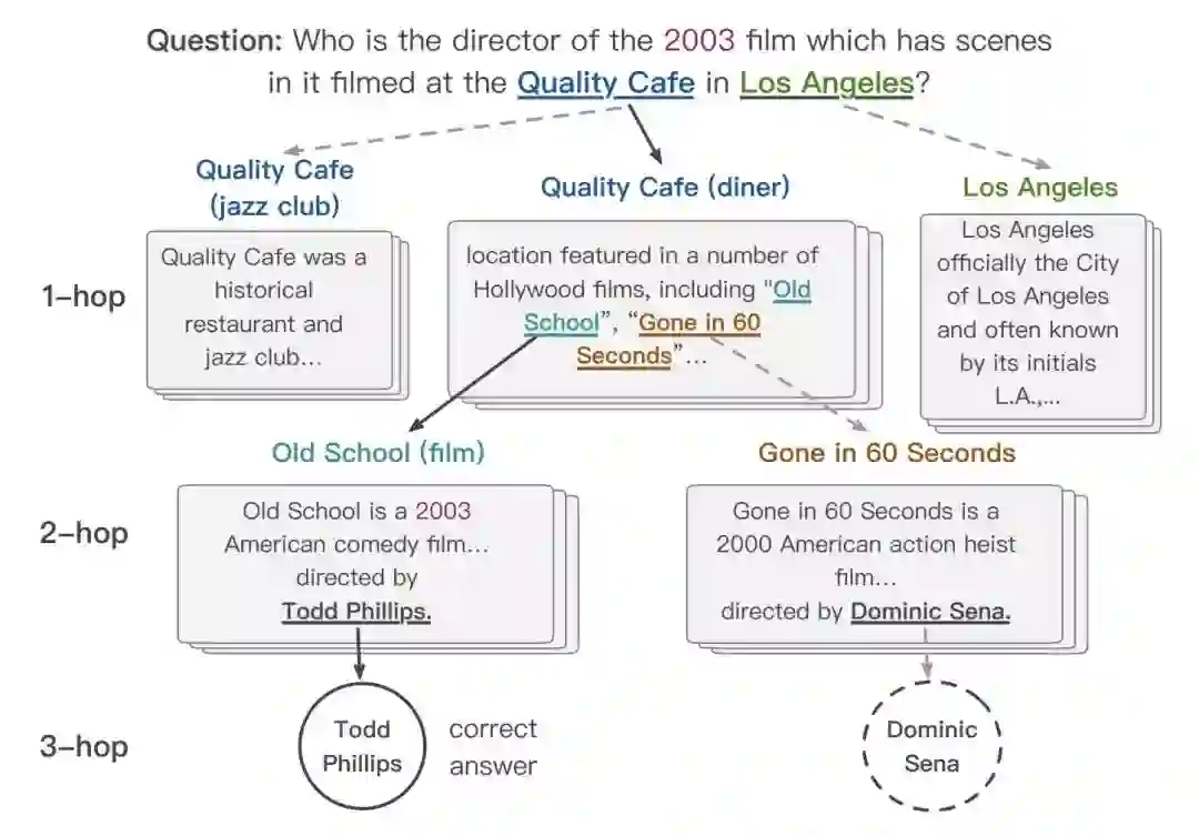 GNN 与 NLP 的结合,关键点也在于 GNN 优秀的推理能力。GNN 在一些场景如:阅读理解、实体识别与关系抽取、依存句法分析中都有应用。下面我们以多跳阅读(Multi-hop reading)为例,多跳阅读是说在阅读理解的过程中,往往需要在多篇文档之间进行多级跳跃式的关联与推理,才能找到正确答案,相比较以前的单文档问答数据集,这是一个更具有开放性与挑战性的推理任务。下图给出了多跳阅读的样例: