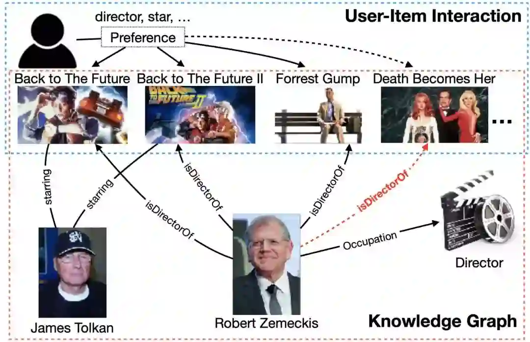除了推荐系统算法模型本身的研究,另一种思路在于如何使推荐系统有效融合进额外的信息,如用户端社交网络的信息、商品端商品知识图谱的信息。这类信息中通常也蕴含了极强的关系,因此可以非常自然地与用户 - 商品二部图合在一起构成一个更大的异构图。下图给出了与电影知识图谱的结合示意图: