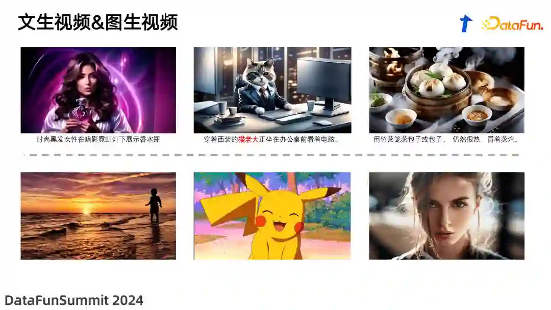 这里展示的是截至 2023 年年底的一些效果。上半部分是基于文生视频的示例,由文字描述控制视频内容的生成。下半部分是基于单张图片控制的“图生视频”,不再需要文本控制,可以直接从一张静态图片生成动态的视频。