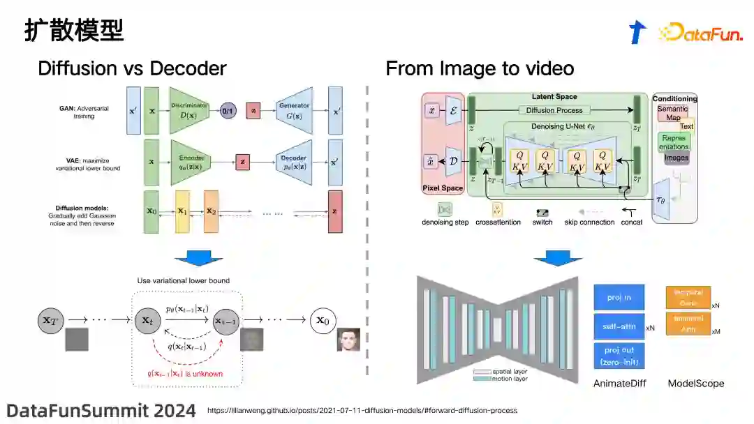 基于扩散模型模式的视频生成技术,是从 2022 年上半年才开始出现的。在两年的时间里,这一技术取得了显著的进步。由上图中可以看到,从 Google 在2022 年 4 月发布的文章所展示的效果,到腾讯在 2023 年 12 月发布的 hunyuan 的效果,无论在画质、光影的重建,还是整个画面的连续性上,都实现了显著的提升。在过去两年间,这一领域吸引了众多参与者,包括各大公司和研究机构,比如上海人工智能研究院,以及一些高校。在这个赛道中,诞生了许多引人注目的成果。从最初的 VDM 模型,到我们常听到的老玩家 Runway Gen1 和 Gen2 的工作,以及去年备受关注的 PikaLab。PikaLab 由两位华人女性科学家创立,它的上市甚至引发了中国 A 股市场上某些股票的剧烈波动。此外,还有腾讯之前的 VideoCrafter 系列,以及阿里的 ModelScope 系列等。当然,最让人印象深刻的是在今年 2 月 15 日,OpenAI 发布了颇具影响力的 Sora 模型。这款 Sora 模型的出现,使得其它模型相比之下显得普通了许多。我们当时还在纠结于生成 4 秒到 8 秒的视频,而 Sora 模型直接将视频生成的时长扩展到了 1 分钟。这一突破显著提升了视频生成技术的能力。