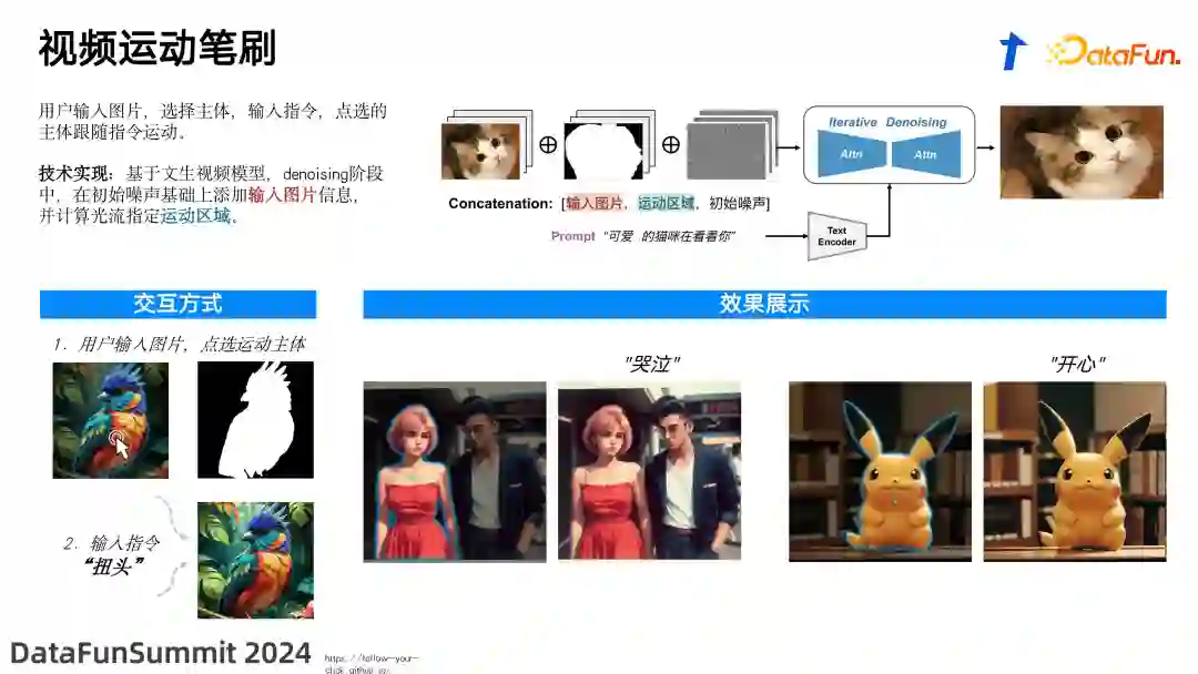 视频运动笔刷可以让视频中的局部区域动起来,这对于工业应用中提高效率非常有用。具体操作是,通过用户的控制让画面中某个局部区域进行动态表现,控制方式包括选择特定区域以及输入相关文本。例如,用户可以点击图中某个区域,如让画中的女神开始哭泣,或让皮卡丘显得更加开心而笑起来。在技术实现上,我们在输入的 condition 中加入了一些特定功能来实现这样的效果。首先,用户的点击会触发对该区块的实例分割,产生一个 mask。这个 mask 随后会被用于 cross attention 过程中,与输出即 denoise 的输入一起工作。在 attention 过程中,加入的 mask 将增强被选区域的动态效果,同时抑制 mask 之外的区域动作,从而使得指定区域的运动更加丰富和明显。这种技术不仅增加了视频内容的互动性和动态表现,还提高了制作过程的灵活性和效率。