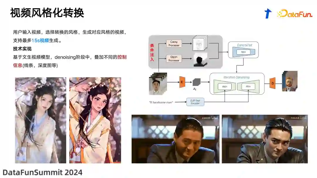 视频风格化是将真实视频或动画视频转化成其他风格视频的过程。这里展示的示例包括将真实视频转化成日本动漫风格,以及将真实视频转化成 3D 动画风格。这种转化不仅可以应用于模特拍摄的视频生成对应的动画画面,还可以用于风景视频的风格迁移。例如,我们曾与人民日报合作制作了一系列名为“江山如此多娇”的短片,其中包括对风景进行风格化处理,效果非常引人注目,大家可以在微信视频号中搜索观看。具体的实现方法包括将视频作为 condition 输入,这里的 condition 不仅包括常规的 RGB 信号,还包括 Canny 边缘检测信号、深度信息和人物骨架控制等信号序列。这些信号通过 ControlNet 的形式注入到 unet 中,从而生成相应的风格化视频。之所以能够生成特定风格的视频,是因为我们对 unet 进行了针对该独立风格的微调,使其成为一个只能生成动漫风格视频的网络。因此,基于原始视频的控制信号,加上专门生成动漫风格的模型,我们可以生成与原视频内容对齐的动漫风格视频。这种技术不仅提升了视频的视觉效果,也增加了内容的多样性和趣味性。
