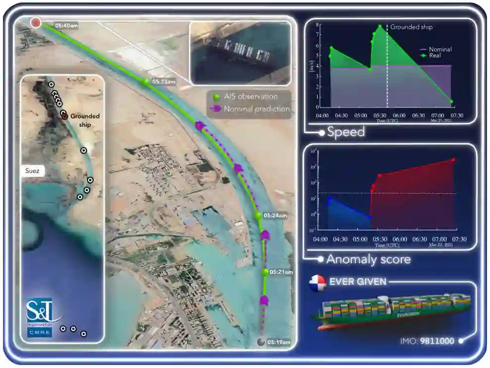 基于监视系统提供的船舶运动学数据的创新统计表示,最近在自动海上异常检测方面的进展[15], [17], [18]为揭示船舶的异常行为和意外模式提供了可能性。在这种情况下,自动异常检测工具已成功应用于2021年集装箱船Ever Given[19]的真实世界重大事件,该船于3月23日在苏伊士运河搁浅(见图1)。据估计,该堵塞事件每天影响96亿美元的货物,或约占世界贸易总额的12%[2]。异常检测器被设计用来处理可用的报告序列,如AIS数据、来自地面或卫星雷达系统的信息(如果有的话),以及定义预期的航行名义行为的上下文信息,以决定是否在特定的时间段内发生了偏离名义行为的情况,例如,两个连续数据点。基于Ever Given号记录的AIS数据的结果显示,拟议的自动异常检测器可以在搁浅前整整19分钟被触发,并对异常行为发出警报。这显然可以帮助避免对海上交通和全球贸易造成如此负面影响的事故。