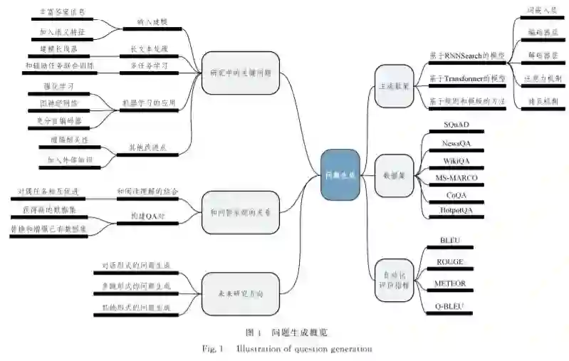 问题生成是指机器主动对一段文本进行提问,生成一个自然语言的问题.神经问题生成则是完全采用端到端的训练方式,使用神经网络完成文档和答案到问题的转换,是自然语言处理中一个新兴而又重要的研究方向.文中首先对神经问题生 成进行了简单介绍,包括基本概念、主流框架和评价方法. 接着介绍了该研究方向的关键问题,包括输入建模、长文本处理、多任务学习、机器学习方法的应用、其他研究问题和改进点.最后,介绍了问题生成和问答系统的关系,以及问题生成的未来研究方向。