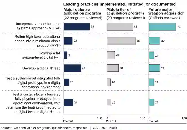 美国政府问责局审查的大多数项目未协同充分实施领先实践以实现效率。例如,大多数项目报告使用了模块化开放系统方法——通常为法规所要求——这使它们能够随时间推移容易地添加或替换武器部件。然而,少数报告了计划建立最小可行产品(一组可以迭代的初始能力)、使用数字化孪生(物理产品的虚拟表示)或使用数字化主线(为决策提供信息的实时数据)。当这些实践作为产品开发迭代方法的一部分一起使用时最有效。