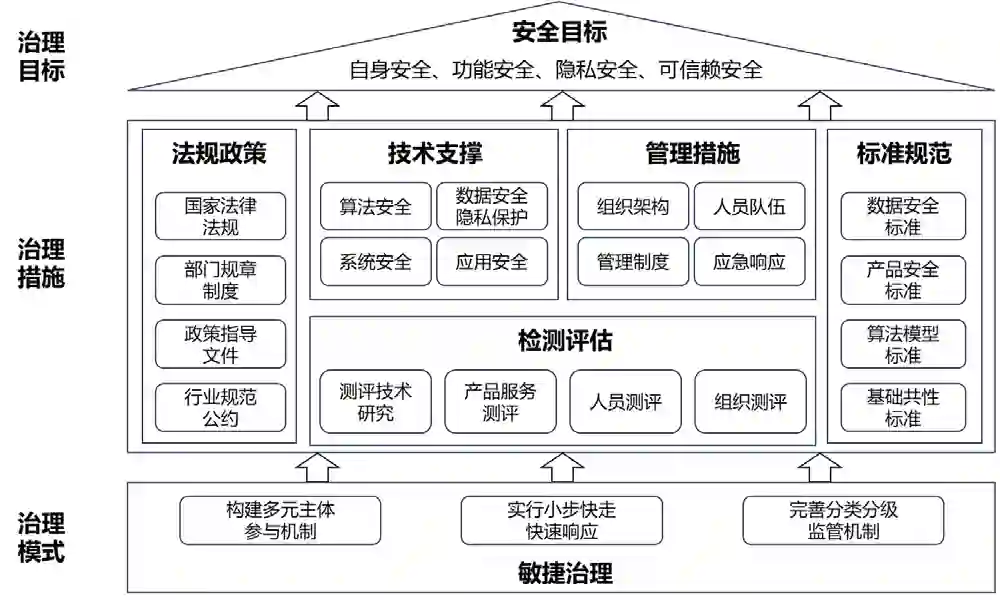 针对人工智能面临的安全挑战,本文提出了一个人工智能安全治理框架,明确了治理目标,归纳了法规政策、标准规范、技术支撑、监测评估、管理措施等多类治理措施,提出了敏捷治理模式,如图所示。
