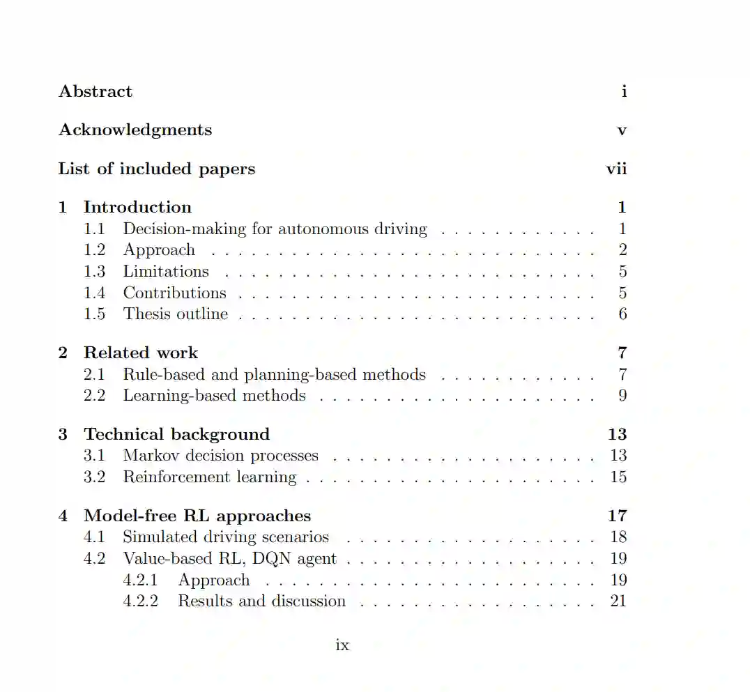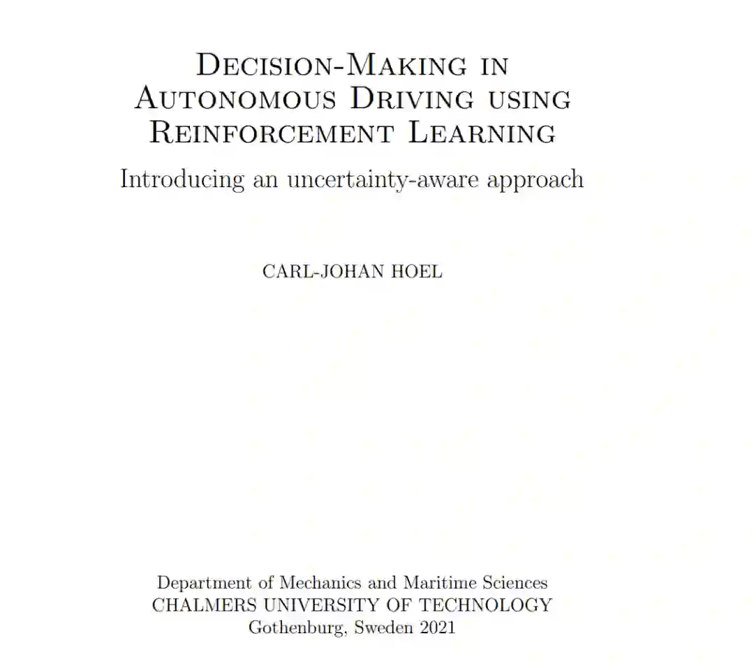 **本文的主要研究课题是自动驾驶的战术决策。**自动驾驶汽车必须能够处理一系列不同的环境和交通情况,这使得手动指定每个可能的场景的合适行为变得困难。因此,本文考虑基于学习的策略,介绍了不同的基于强化学习的方法。基于深度Q网络(Deep Q-Network, DQN)算法,提出一种通用决策智能体。经过少量修改,该方法可以适用于不同的驾驶环境,并在多种高速公路和交叉路口的仿真场景中得到了验证。通过引入更多的领域知识,以蒙特卡洛树搜索和强化学习的形式将规划和学习相结合,可以获得样本效率更高的智能体。在不同的高速公路场景中,组合方法优于单独使用基于规划或基于学习的策略,同时所需的训练样本比DQN方法少一个数量级。