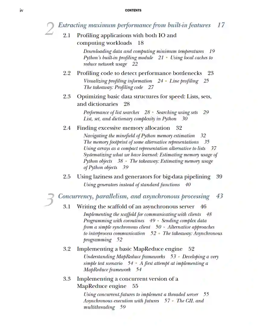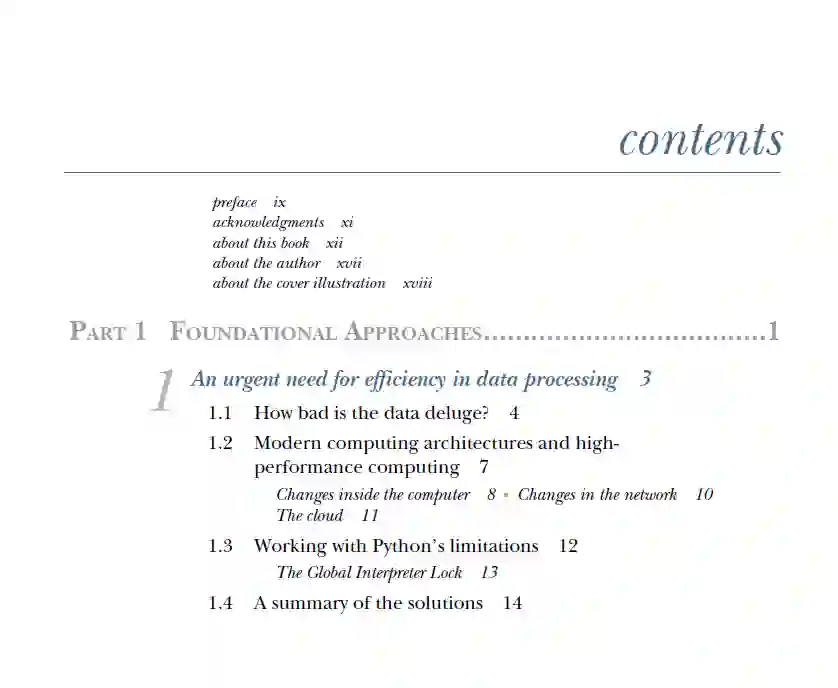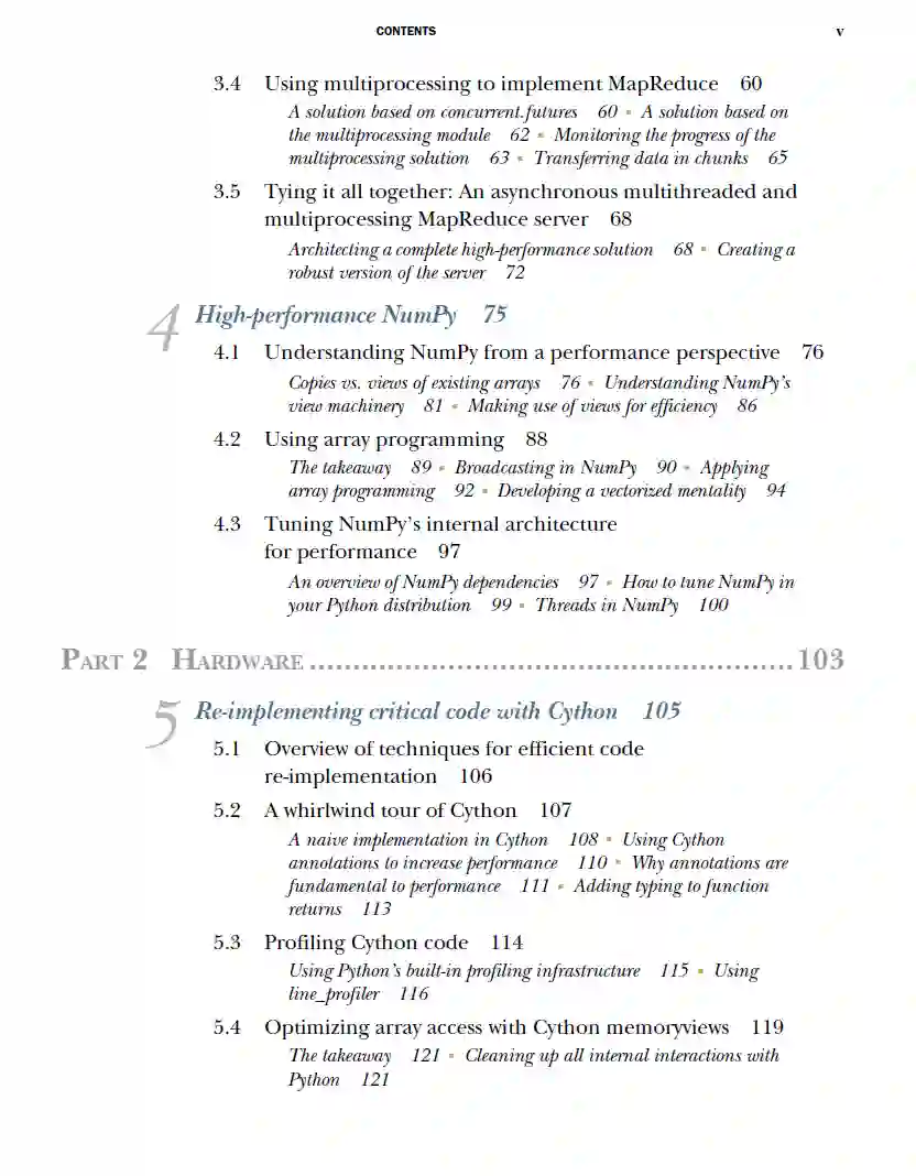 这本书的目的是帮助你在Python生态系统中编写更高效的应用程序。所谓更高效,我的意思是你的代码将使用更少的CPU周期、更少的存储空间和更少的网络通信。本书对性能问题采取了全面的方法。我们不仅讨论了纯Python中的代码优化技术,还考虑了广泛使用的数据库的高效使用,如NumPy和pandas。因为在某些情况下Python的性能不足,所以当我们需要更高的速度时,我们也会考虑使用Cython。与这种全面的方法相一致,我们还讨论了硬件对代码设计的影响:我们分析了现代计算机架构对算法性能的影响。我们还研究了网络架构对效率的影响,并探讨了使用GPU计算进行快速数据分析的用法。 这本书的章节基本上是独立的,你可以跳到对你来说重要的任何章节。话虽如此,这本书分为四个部分。第一部分,基础方法(第1-4章),涵盖了入门材料。 ■ 第1章介绍了这个问题,并解释了为什么我们必须关注计算和存储的效率。它还介绍了本书的方法,并为根据你的需求浏览它提供了建议。 ■ 第2章涵盖了原生Python的优化。我们还讨论了Python数据结构、代码分析、内存分配和延迟编程技术的优化。 ■ 第3章讨论了Python中的并发和并行,并介绍了如何最好地利用多进程和多线程(包括使用线程进行并行处理时的限制)。这一章还涉及了异步处理作为一种高效处理多个并发请求的方式,这种请求的工作量低,典型的是网络服务。 ■ 第4章介绍了NumPy,这是一个允许你高效处理多维数组的库。NumPy是所有现代数据处理技术的核心,因此,它被视为一个基本库。这一章分享了特定的NumPy技术来开发更高效的代码,如视图、广播和数组编程。 第二部分,硬件(第5和6章),主要关注如何从常用硬件和网络中提取最大效率。