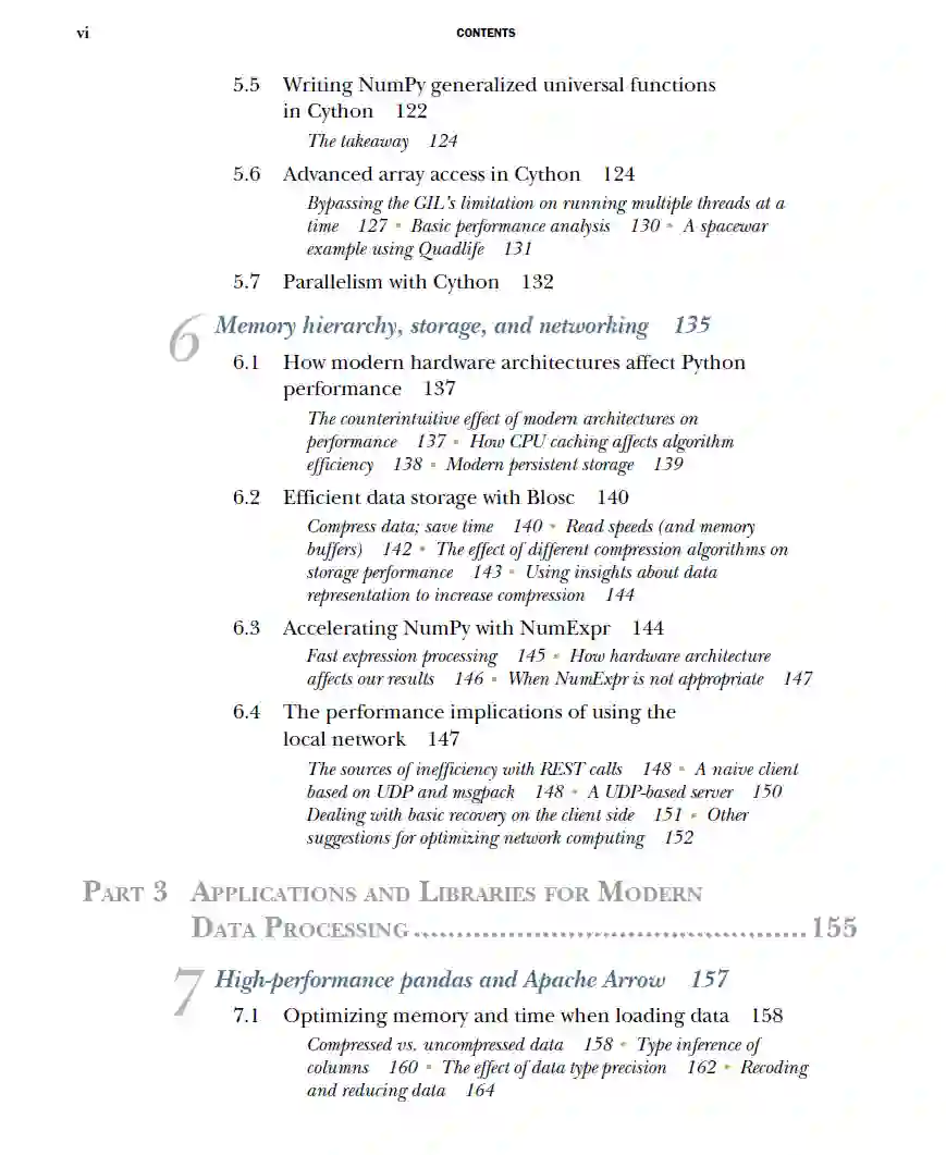 ■ 第6章讨论了现代硬件架构对设计高效Python代码的影响。考虑到现代计算机的设计方式,一些反直觉的编程方法可能比预期的更高效。例如,在某些情况下,处理压缩数据可能比处理未压缩数据更快,即使我们需要支付解压缩算法的代价。这一章还涵盖了CPU、内存、存储和网络对Python算法设计的影响。我们讨论NumExpr,一个可以通过使用现代硬件架构的属性使NumPy代码更高效的库。