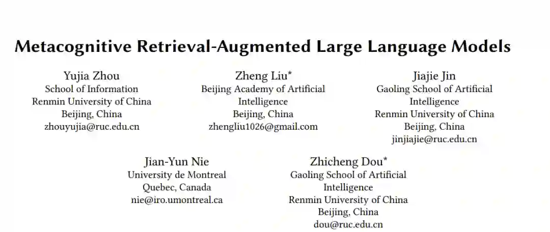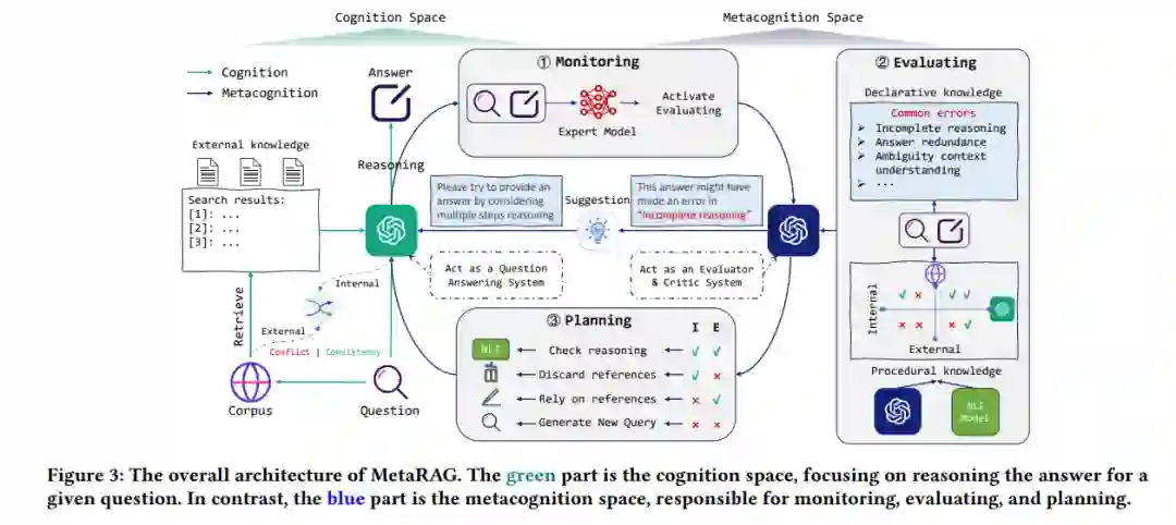检索增强生成已成为自然语言处理的核心,因为它们在生成事实内容方面的有效性。虽然传统方法采用单次检索,但更多最近的方法已转向多次检索,以执行多跳推理任务。然而,这些策略受到预定义推理步骤的限制,可能导致响应生成的不准确性。本文介绍了MetaRAG,一种将检索增强生成过程与元认知相结合的方法。借鉴认知心理学,元认知允许实体自我反思和批判性评估其认知过程。通过整合元认知,MetaRAG使模型能够监控、评估和规划其响应策略,增强其内省推理能力。通过三步元认知调节管道,模型能够识别初步认知响应中的不足并修正它们。实证评估显示MetaRAG显著优于现有方法。