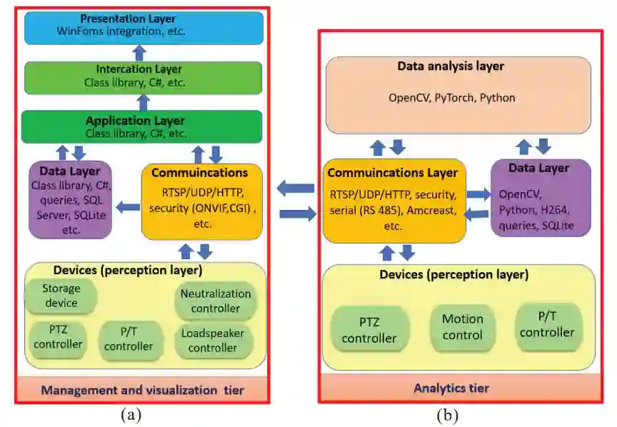 如图 1 所示,本文介绍了视频数据分析仪表板的分层软件架构,它分为两层,以支持反无人机监控系统的运行。一方面,分析师层负责分析和处理数据。数据在这里进行转换、清理和处理,然后发送到管理和可视化层,呈现给用户。分析层还负责整合来自各种传感器的数据。此外,他还提供数据和分析模型,为天空监测系统的决策过程提供支持。管理和可视化层则负责显示数据和管理系统功能。这一层通常包括用户界面,以及控制访问系统数据和功能的组件和逻辑。它还包括管理应用程序的数据、安全性和授权的层。可视化层是系统的一部分,通过桌面应用程序为用户提供界面,使用户能够与系统交互并查看数据。该层还可包括报告、屏幕和其他用于可视化和分析数据的工具。
