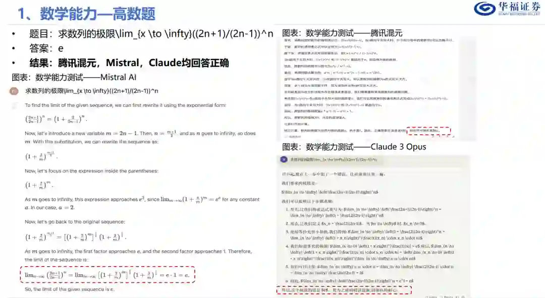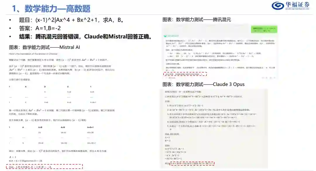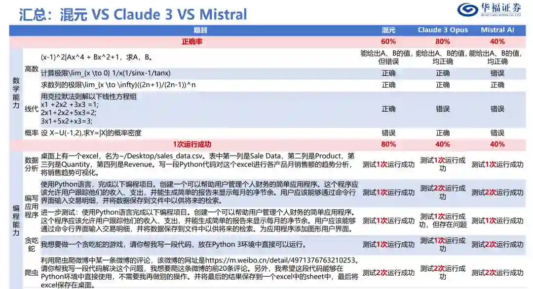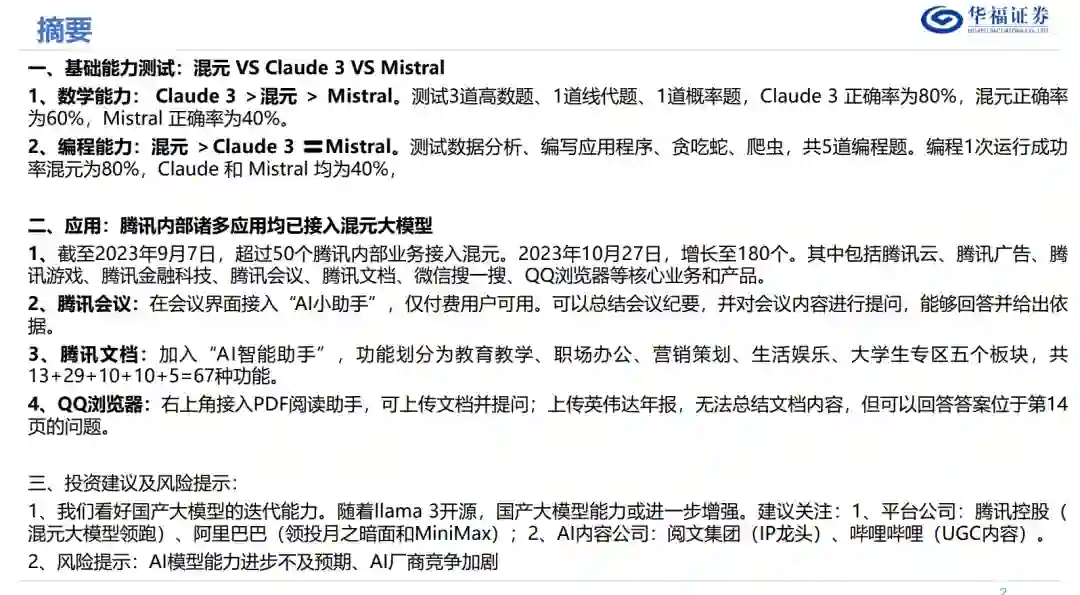 一、基础能力测试:混元VS Claude3VS Mistral 1、数学能力:Claude3>混元>Mistral。测试3道高数题、1道线代题、1道概率题,Claude3正确率为80%,混元正确率为60%,Mistral正确率为40%。 2、编程能力:混元>Claude3Mistral。测试数据分析、编写应用程序、贪吃蛇、爬虫,共5道编程题。编程1次运行成功率混元为80%,Claude和Mistral均为40%, 二、应用:腾讯内部诸多应用均已接入混元大模型 1、截至2023年9月7日,超过50个腾讯内部业务接入混元。2023年10月27日,增长至180个。其中包括腾讯云、腾讯广告、腾讯游戏、腾讯金融科技、腾讯会议、腾讯文档、微信搜一搜、QQ浏览器等核心业务和产品。 2、腾讯会议:在会议界面接入“AI小助手”,仅付费用户可用。可以总结会议纪要,并对会议内容进行提问,能够回答并给出依据。 3、腾讯文档:加入“AI智能助手”,功能划分为教育教学、职场办公、营销策划、生活娱乐、大学生专区五个板块,共13+29+10+10+5=67种功能。 4、QQ浏览器:右上角接入PDF阅读助手,可上传文档并提问;上传英伟达年报,无法总结文档内容,但可以回答答案位于第14页的问题。