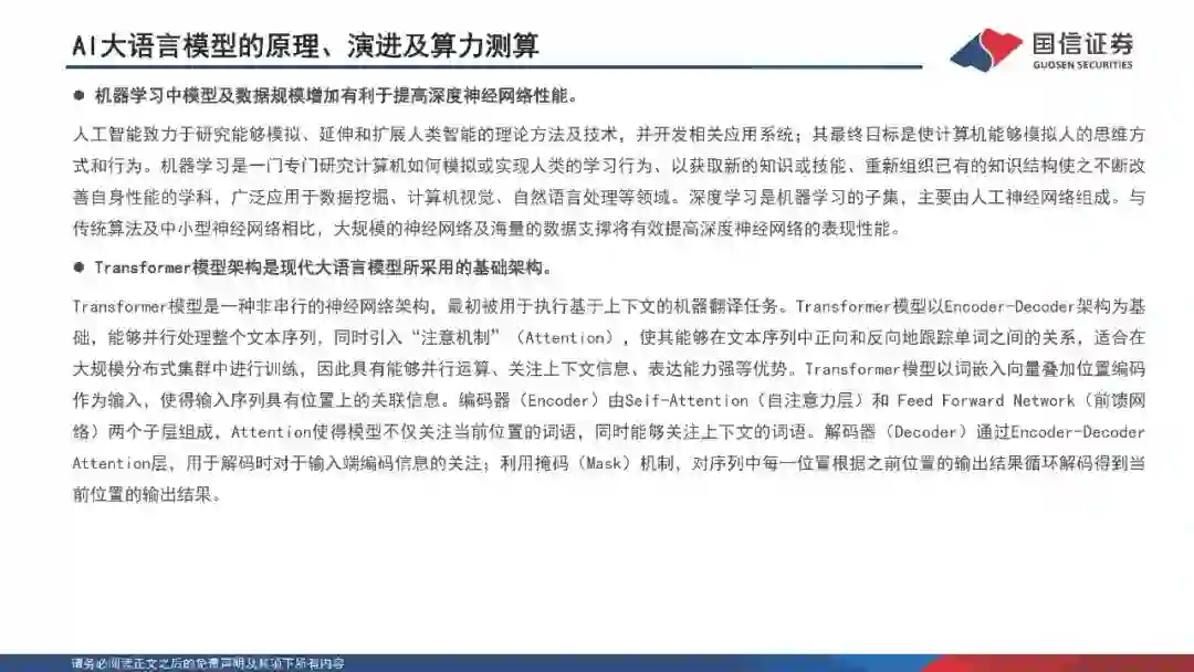 人工智能致力于研究能够模拟、延伸和扩展人类智能的理论方法及技术,并开发相关应用系统;其最终目标是使计算机能够模拟人的思维方式和行为。机器学习是一门专门研究计算机如何模拟或实现人类的学习行为、以获取新的知识或技能、重新组织已有的知识结构使之不断改善自身性能的学科,广泛应用于数据挖掘、计算机视觉、自然语言处理等领域。深度学习是机器学习的子集,主要由人工神经网络组成。与传统算法及中小型神经网络相比,大规模的神经网络及海量的数据支撑将有效提高深度神经网络的表现性能。 Transformer模型架构是现代大语言模型所采用的基础架构。