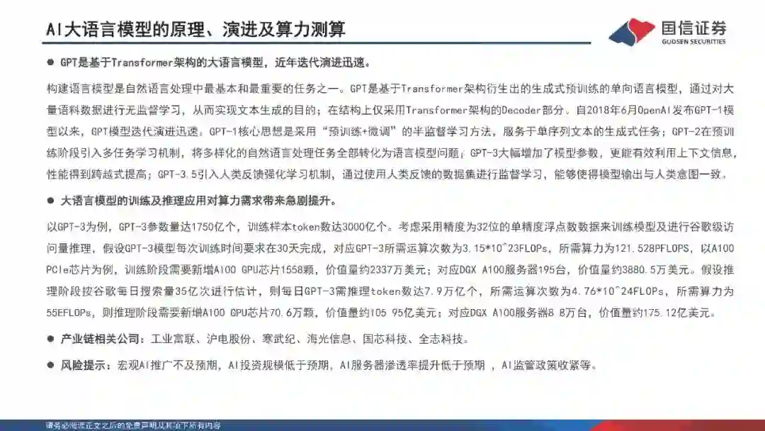 以GPT-3为例,GPT-3参数量达1750亿个,训练样本token数达3000亿个。考虑采用精度为32位的单精度浮点数数据来训练模型及进行谷歌级访问量推理,假设GPT-3模型每次训练时间要求在30天完成,对应GPT-3所需运算次数为3.1510^23FLOPs,所需算力为121.528PFLOPS,以A100PCle芯片为例,训练阶段需要新增A100GPU芯片1558颗,价值量约2337万美元;对应DGXA100服务器195台,价值量约3880.5万美元。假设推理阶段按谷歌每日搜索量35亿次进行估计,则每日GPT-3需推理token数达7.9万亿个,所需运算次数为4.7610^24FLOPs,所需算力为55EFLOPs,则推理阶段需要新增A100GPU芯片70.6万颗,价值量约105.95亿美元;对应DGXA100服务器8.8万台,价值量约175.12亿美元。