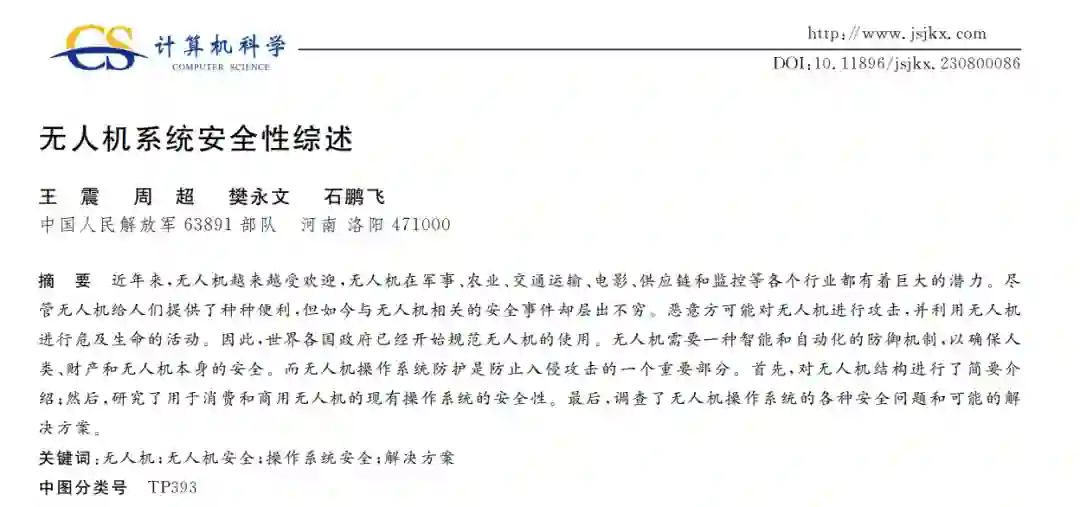 近年来,无人机越来越受欢迎,无人机在军事、农业、交通运输、电影、供应链和监控等各个行业都有着巨大的潜力.尽管无人机给人们提供了种种便利,但如今与无人机相关的安全事件却层出不穷.恶意方可能对无人机进行攻击,并利用无人机进行危及生命的活动.因此,世界各国政府已经开始规范无人机的使用.无人机需要一种智能和自动化的防御机制,以确保人类、财产和无人机本身的安全.而无人机操作系统防护是防止入侵攻击的一个重要部分.首先,对无人机结构进行了简要介绍;然后,研究了用于消费和商用无人机的现有操作系统的安全性.最后,调查了无人机操作系统的各种安全问题和可能的解决方案. 无人机被定义为利用无线电遥控设备和自备的程序控制 装置操纵的不载人飞机[1].近年来,无人机已经成为人们重 点关注的领域,因为其可以用于许多军事和民用应用,包括军 事攻击、国家情报和监视、边境安全、通信中继、农业和遥感 等.此外,无人机爱好者和各行各业的研究人员正在不断寻 找有效使用无人机[2G3]的方法,无人机的应用彻底改变了许多 企业并为其发展创造了新的机会. 和所有的新技 术 一 样,无 人 机 也 可 以 被 恶 意 使 用,也 可以成为恶意 行 为 者 的 攻 击 目 标.无 人 机 遥 控 主 要 采 用 一个飞行控制器,该 控 制 器 由 传 感 器 和 执 行 器 组 成 网 络, 通过通信链路与地面控制系统进 行 通 信.因 此,无 人 机 系 统很容易受到针 对 网 络、控 制 器、无 线 链 路 或 多 个 组 件[4] 组合的攻击.目 前 有 许 多 无 人 机 相 关 事 件 的 报 道[5G7],一 些国家已经采 取 了 天 空 管 制 的 政 策[8].无 人 机 也 可 能 对 隐私和人类安 全 造 成 威 胁[9].比 如 一 架 装 有 摄 像 头 和 麦 克风的无人机在我们的私人空域内飞 行,我 们 几 乎 不 可 能 识别出操控无 人 机 的 人.事 实 上,即 使 有 严 格 的 规 定,恶 意用户也会将无人机用于非法目 的.因 此,反 无 人 机 技 术 也在不断发展,利用跟踪、干扰等技术摧毁恶意无人机. 除了检测和禁用恶意无人机,我们还需要技术来保护无 人机免受外部恶意行动者的攻击.每个系统都存在漏洞,无 人机也不例外.针对无人机的网络攻击可以对大型飞机、机 场和人类财产等物理实体构成重大的安全风险.如果无人机 受到攻击,则可能会比普通IT 设备造成更长的影响.因此, 和像汽车行业一样,无人机需要高度可靠的软件和严格的监 管合规. 负责确保无人机安全的主要组件之一是操作系统.然 而,大多数无人机仍然使用为无人机飞行控制器专门定制的 基本实时调度器或操作系统/固件.因此,未来的无人机需要 复杂的操作系统,以使无人机更高效、更轻量、更自主.本文 首先研究了现有的用于开源和商用无人机的操作系统;然后, 分析了无人机操作系统有关安全的问题,并确定了需要重点 关注的未来无人机操作系统面临的安全性挑战.