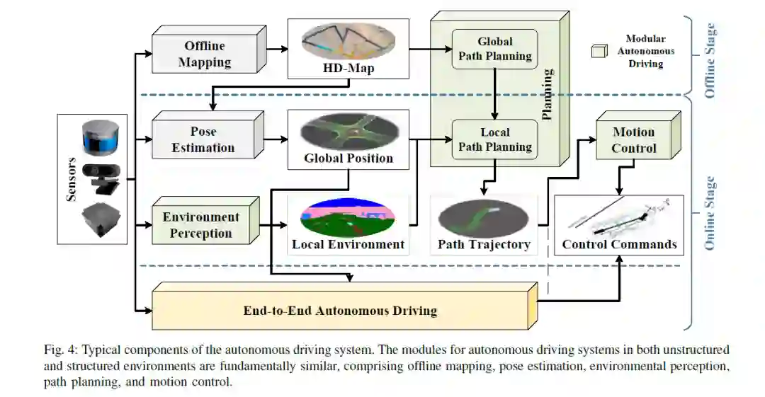 传统的模块化自动驾驶系统的工作流程如图4所示。在离线准备阶段,系统首先使用离线建图模块创建目标环境的高精度先验地图。接着,基于车辆的实际自动驾驶任务需求,全局路径规划模块生成一个全局路径,为自动驾驶提供方向性指导。一旦在线驾驶阶段开始,系统便接收由车载传感器收集的实时数据。位姿估计模块确定车辆的瞬时位置和方向,环境感知模块则分析周围环境的实时情况。随后,本地路径规划模块生成车辆应遵循的本地驾驶路径,运动控制模块将这些路径转化为具体的控制指令。