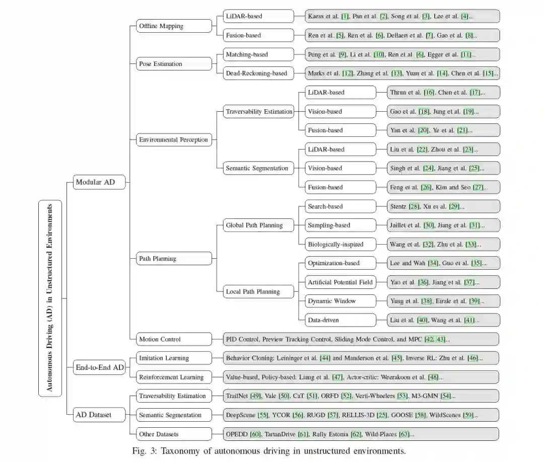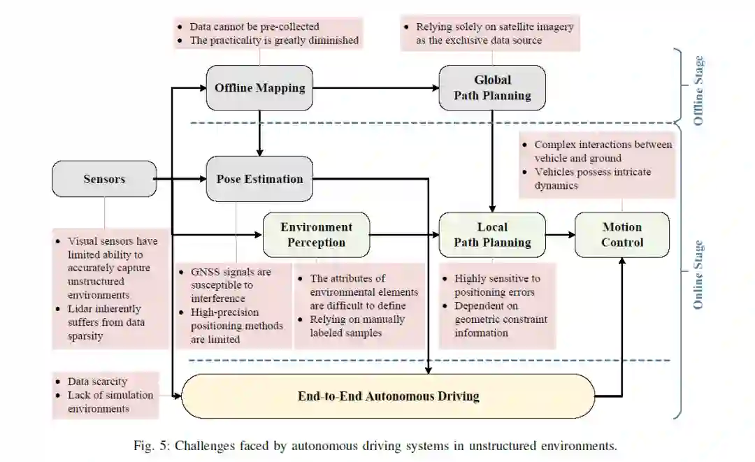 这些模块间的密切协作实现了系统的自动驾驶功能。然而,如图5所示,在面对复杂且未知的非结构化环境时,自动驾驶系统的每个核心模块都遇到了不同程度的挑战,显著阻碍了工作流程的正常运作。自动驾驶系统首先具备一个地图构建模块,用于创建环境的详细表示,存储静态数据以支持位姿估计和规划。然而,在如灾区的非结构化环境中,通常无法预先收集数据,限制了地图的实用性【6, 72】。映射过程通常利用SLAM技术及各种传感器类型,LiDAR方法尤为有效【73, 74】。即使可以收集数据,关键元素的缺失(如标志)也显著降低了地图的实际价值,而地形的自然变化需要频繁更新,导致运营成本上升。本综述将回顾非结构化环境中离线建图面临的挑战,以及包括LiDAR和融合方法在内的各种方法。我们将回顾该环境中的位姿估计方法,包括基于地图匹配和里程计的方法。 环境感知的目标是理解车辆的周围环境【75】。在非结构化环境中,车辆的主要任务是识别障碍物并确定可行驶区域。我们首先回顾可行驶性估计算法,包括基于LiDAR、基于视觉以及基于融合的方法【76】。随着深度学习技术的进步【77】,语义分割方法已应用于非结构化场景,增强了车辆对其周围环境的全面理解。 非结构化环境中的路径规划面临几项关键挑战,与结构化环境有显著不同。这些挑战包括处理高度不确定性和动态变化、导航复杂的状态空间、应对有限的先验知识、满足实时操作需求以及解决长期规划的复杂性【78】。我们将深入探讨这些挑战,并研究为非结构化环境设计的全局和本地路径规划算法,这些算法可分为基于搜索、基于采样、基于优化、基于人工势场、基于动态窗口、受生物启发和数据驱动的方法。 车辆运动控制作为车辆的“手足”,在导航复杂的非结构化地形时出现了独特的建模挑战,导致车辆与地面的复杂相互作用,进而影响高速控制。不规则地形(如雨雪影响)导致牵引变化和负载分布不均,从而影响稳定性。此外,每辆车的特性(如重量分布)对其响应输入起着关键作用,强调了了解这些动力学对有效控制的重要性。我们将回顾适用于非结构化环境的运动控制方法。 上述模块化自动驾驶系统具有较强的可解释性,便于定位问题,但信息在传输过程中可能丢失【79】。如图4所示,端到端自动驾驶利用单一网络直接从传感器数据输出控制信号,相较于模块化自动驾驶算法显著减少信息丢失【80】。此外,非结构化场景复杂多变,使得数据收集和标注充满挑战。例如,基于模仿学习的端到端自动驾驶只需收集驾驶员数据进行训练,促进了非结构化环境中自动驾驶技术的快速发展。本文介绍了当前聚焦于非结构化场景的端到端自动驾驶算法,预计该领域将在未来迅速发展。 近年来,深度学习显著推动了自动驾驶技术发展,主要依赖于带有良好标注的数据集【81】。已有若干专为非结构化环境设计的数据集(如RELLIS-3D【25】、RUGD【57】和ORFD【52】)。这些数据集主要关注可行驶性估计和语义分割任务,并使用了RGB相机、LiDAR、立体相机和IMU等传感器。尽管这些数据集推动了非结构化场景中自动驾驶技术的发展,但其规模仍相对较小,表明在规模扩展和改进方面的需求。 本综述旨在全面概述和分析非结构化环境中自动驾驶技术的现状、挑战和未来研究方向。为新进入该领域的研究者提供有价值的见解,同时推动资深研究者之间的深入讨论。第一节讨论非结构化环境中的离线建图,第二节回顾位姿估计方法,第三节介绍环境感知方法,第四节探讨路径规划方法,第五节讨论运动控制。第六节聚焦于端到端自动驾驶方法,第七节回顾与非结构化环境自动驾驶相关的数据集。第八节提出若干未来研究方向,最后第九节对非结构化环境中的自动驾驶给出相关结论。 本综述的主要贡献包括: