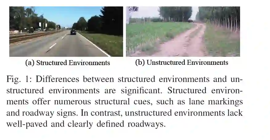 近年来,自动驾驶技术在结构化环境(如城市区域和高速公路)中取得了显著进展。许多自动驾驶系统在实际应用中展示了其能力,这得益于它们依赖标准化标识,如车道线、交通信号和路标。这些标识使得自动驾驶车辆能够精确地执行路径规划和决策。然而,现实世界中常常存在非结构化环境。如图1所示,非结构化户外环境与其结构化城市环境有显著不同。诸如山区、丛林和沙漠等非结构化环境缺乏明确的路标、交通信号和车道标记,包括乡村道路、越野地形、施工场地、停车场和其他高复杂性和不确定性的区域。