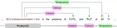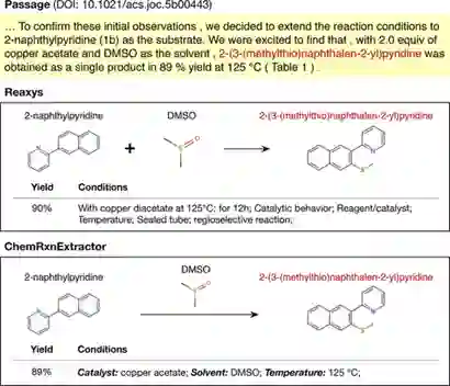 最后,将提取后的反应与人工构建的Reaxys数据库进行了定性比较。例如图3中的反应,最明显的是“DMSO”被ChemRxnExtractor系统识别为溶剂,这符合文本描述。但Reaxys将“DMSO”归为反应物,因为其确实作为硫源参与了这个反应。Reaxys报告的反应产率值是四舍五入的,与此相反,该系统设计为文章中精确数值。 但是,因为该系统提取的内容是基于有限的段落,无法提取前后文中的特定反应角色。如图3中,Reaxys提供的反应时间、反应过程等信息,均在该系统中缺失。