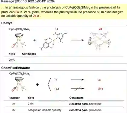 图4. ChemRxnExtractor提取与Reaxys中手动抽取CpFe(CO)2 SiMe3在与不同的反应物偶合时得到不同的结果的比较总结