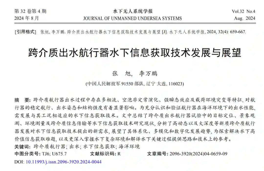 跨介质航行器出水过程中存在多相流、空泡非定常演化、强瞬态效应及载荷环境突变等特征, 对航 行器的稳定航行、出水姿态和结构强度有着显著影响。为充分认识和验证航行器在海洋环境下的出水性能, 需发展与其工况相适应的水下信息获取技术。文中总结了跨介质出水航行器试验中的目标定位、景象观 测、环境测量及跨介质信息传输等水下信息获取技术研究现状, 分析了高动态以及大深度等新质跨介质航行 器发展对水下信息获取技术提出的新需求, 展望了其体系化、多模化和数字化发展趋势, 为探索解决水下高 价值信息获取难题, 以及更深入掌握水下复杂环境和解译水下关键过程提供思路和技术上的参考。