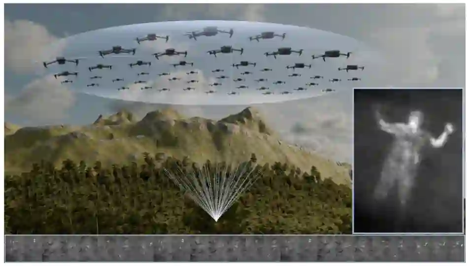 图 1. 无人机群对极宽适应性机载镜头的光学信号进行集体采样。每架无人机拍摄的画面(下图)都能覆盖较大的景深,这得益于集成相机镜头较窄的物理孔径。在这里,被严重遮挡的目标只能看到一小部分。通过整合这些图像,我们模拟了非常宽的合成孔径镜头(尺寸等于蜂群的采样区域)的极浅景深。因此,离焦遮挡被抑制,而合成焦平面内的目标(如森林地面上的目标)则被突出显示(右图)。由于可以根据合理的观察条件(如森林密度)动态控制蜂群的采样形成,因此合成光圈是可适应的,而不是固定不变的。