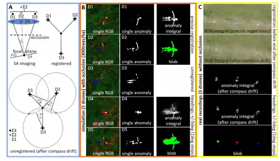 图 2. 集成原理。(A) 使用三架无人机(D1、D2、D3)在确定的合成焦平面(SA 成像)上抑制遮挡和抑制未知航向参数(已注册与未注册)造成的注册伪影的集成原理示意图。(B) 5 架无人机(D1-D5)和一个躺在森林(300 棵/公顷)中的被遮挡者的模拟示例。单张 RGB 图像(左列)。相应的单个异常图像(中间一列)。精确定位和不精确定位(由于航向误差)情况下,以 1º 为步长对 10 个航向变化进行积分后的闭塞抑制异常积分和圆块检测结果(右栏)。模拟器的详情见 (27)。(C) 三架无人机对地面上三个未排除的圆形目标的真实记录。上、中、下: 精确初始注册后和罗盘漂移导致错误注册后的 RGB 积分。罗盘漂移后的异常积分。罗盘漂移后的异常积分,包括航向积分和最终的圆球检测。