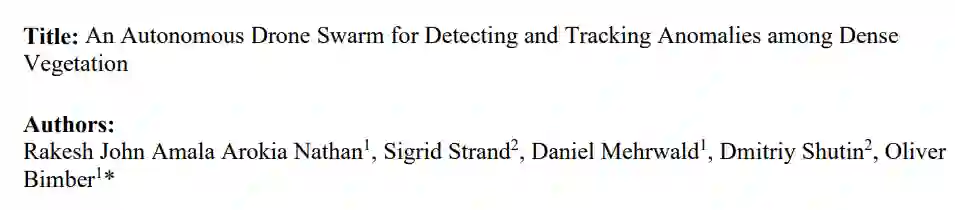 无人机蜂群提供了更大的感知孔径,模仿自然蜂群的行为,使孔径适应当地条件,从而增强采样效果。我们证明,这种方法使探测和跟踪严重遮挡目标变得切实可行。应用于传统航空图像的物体分类对遮挡的随机性概括性很差,因此即使在轻度遮挡的条件下也效率不高,而应用于合成孔径积分图像的异常检测对森林等茂密植被具有鲁棒性,并且与预先训练的类别无关。我们的自主蜂群会搜索环境中出现的未知或意外情况,对其进行跟踪,同时不断调整采样模式,以优化当地的观察条件。在由六架无人机组成的蜂群进行的实际现场实验中,我们取得了 0.39 米的平均定位精度,平均精确率为 93.2%,平均召回率为 95.9%。在这里,调整后的粒子群优化考虑了检测可信度和预测的目标外观。我们的研究表明,在合成孔径图像整合过程中可以有效地将传感器噪声包括在内,从而无需对高维参数空间进行计算成本高昂的优化。最后,我们介绍了一个完整的硬件和软件框架,它支持低延迟传输(往返时间约为 80 毫秒)和快速处理(每个编队步骤约为 600 毫秒)大量(70-120 Mbit/s)视频和遥测数据,以及多达十架无人机的蜂群控制。