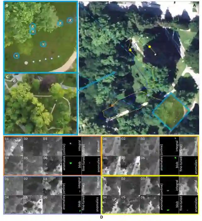 图 6. 密林中的探测和跟踪。在困难的条件下(严重遮挡),蜂群会探测并跟踪看起来最不正常的目标(在本例中为并排行走的两个人)。(A) 卫星图像,包括车辆的地面路径(黄色)和跟踪蜂群的路径(蜂群的重心,蓝线)。(B、C)特写(无人机被包围)。(D) 单个无人机图像(D1...D6,目标位置用方框表示)、热积分和异常积分的可视化结果,以及在不同航点(A 中用圆圈表示,D 中用匹配的帧颜色表示)检测到的圆球。请注意,热图像是用颜色编码的(热 = 红色,冷 = 灰色)。该实验记录在补充视频 4(实验 III)中。
