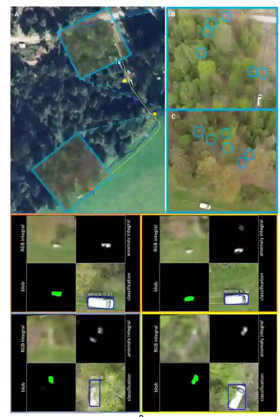 图 4. 稀疏森林中的检测、跟踪和分类。在简单条件下(无遮挡或遮挡较少),蜂群会检测并跟踪看起来最不正常的目标(一辆移动的车辆)。(A) 卫星图像,包含车辆的地面实况路径(黄色)和跟踪蜂群的路径(蜂群重心,蓝线)。(B,C) 不同时间的特写(无人机被包围)。(D) RGB 和异常积分的可视化结果、检测到的 Blob 以及不同航点的分类结果(A 中以圆圈表示,D 中以匹配的帧颜色表示)。本实验记录在补充视频 2(实验 I)中。