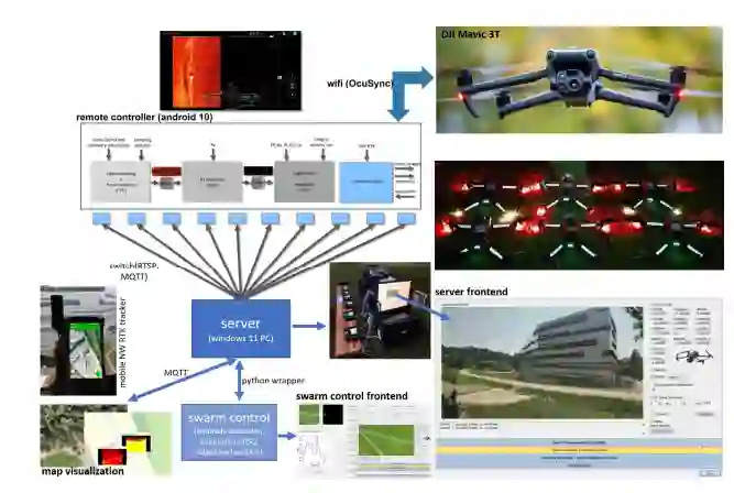 图 7. 软硬件架构。无人机群中的无人机由远程控制器上运行的定制应用程序直接控制。视频和遥测数据从远程控制器向下传输,航点数据从中央电脑上运行的定制服务器向上传输。服务器上的数据可由定制客户端下载/上传,如处理数据和控制蜂群的蜂群控制客户端(如主论文中所述),以及在地图上显示蜂群状态的地图可视化客户端。参见补充视频 5(方法)。