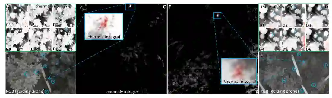图 5. 密林中的引导搜索。为了在弱光条件下的密林中找到躺着(A-C)和站着(D-F)的人,无人机群被引导到预计目标所在的搜索区域,然后自主探索这些区域。(B、E)无人机引导者的视图(RGB),蜂群无人机被包围。(A、D)无人机群的视图(D1...D6,目标位置用方框表示)。(C,F)热积分和异常积分也揭示了单张图像中隐藏的人员异常。请注意,热图像是用颜色编码的(热图像 = 红色,冷图像 = 灰色)。本实验录制于补充视频 3(实验二)。