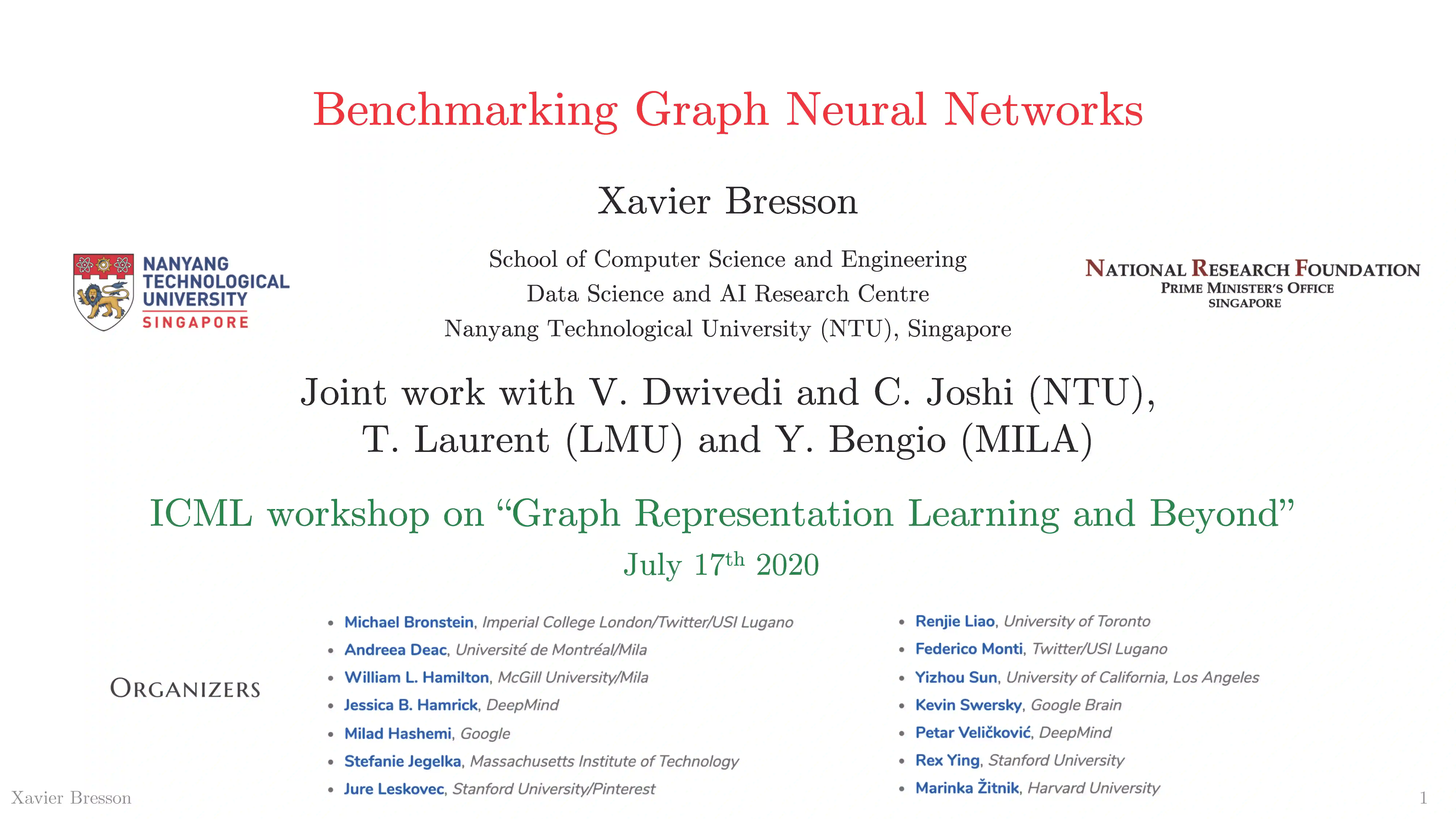 在ICML2020 图表示学习论坛上,NUS Xavier Bresson副教授做了关于《图神经网络基准》的报告,非常干活!