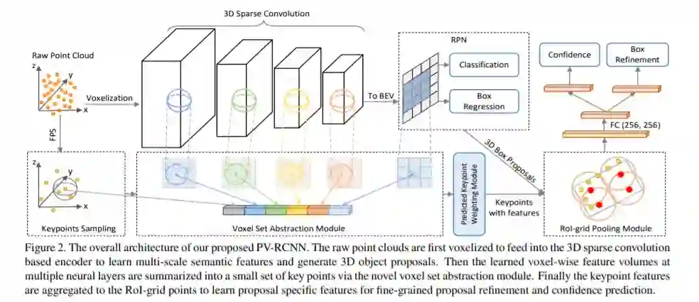 本文的特征提取方式充分利用的3D voxel卷积和基于点的pointnet卷积方式。其中作者给出的解释是3D voxel卷积高效,而point-based的方法感受野可变,因此结合了这两种检测方法的优点。