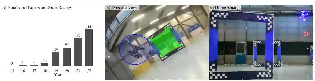 无人机竞赛是一个具有挑战性的基准,可以帮助研究人员衡量复杂的感知、规划和控制算法的进展。比赛中的自主无人机必须能够在几十毫秒的范围内进行感知、推理、计划和行动,所有这些都在一个计算有限的平台上进行。除了具有很大的挑战性外,无人机竞赛任务提供了一个衡量自主飞行机器人技术进展的唯一标准:单圈时间。解决这个问题需要算法高效、轻便,并实时提供最佳决策和控制行为。此外,如图1所示,我们看到该领域的论文数量逐年呈指数式增长。