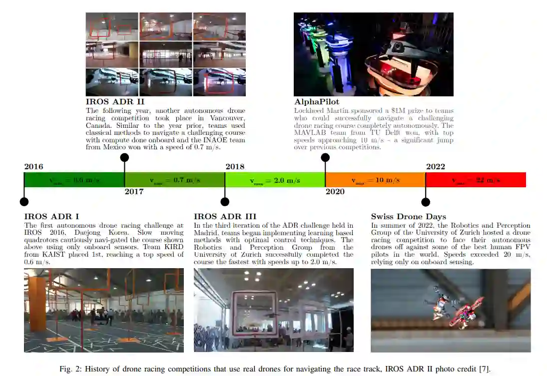 在过去的五年里,已经启动了几个项目来鼓励该领域的快速进展,如DARPA的快速轻量级自主(FLA)[8]和欧洲研究理事会的AgileFlight[9]。这些项目的资金池都超过100万美元,并具有巨大的商业潜力,这对研究人员和企业家探索敏捷飞行研究的新模式有很大的激励作用。诸如IROS'16-19自主无人机竞赛系列[10]、NeurIPS 2019的无人机游戏[11]和2019年AlphaPilot挑战赛[12]、[13]等竞赛为研究人员提供了进一步的机会,以竞争方式相互比较他们的方法。图2中可以看到这些比赛所取得的进展的描述。