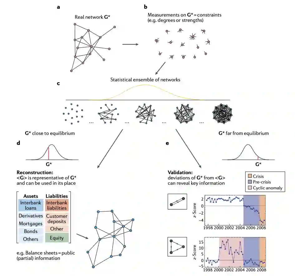 面对金融网络高维、缺失数据与保密限制,统计物理学提供了**最大熵网络集成 **(maximum entropy ensembles) 的方法论:在只知节点度(degree)或节点强度(strength)等局部约束的情况下,通过最大化香农熵构造图谱的概率分布,既可作为缺失数据条件下的“最佳猜测”进行网络重构 (network reconstruction),也可作为已观测网络的平衡态 (equilibrium) 基准,识别异常亚结构作为危机前兆 。例如,对荷兰银行业网络中二元与三元环的统计显著性变化能够早于2008年危机发生而给出预警。此外,将经济学中的瓦尔拉斯均衡 (Walrasian equilibrium)与热力学平衡相结合,进一步揭示如果真实网络确实源于市场均衡,则在相同供需约束下所允许的所有配置应同属热力学平衡态,从而为理论与实证研究提供统一视角。