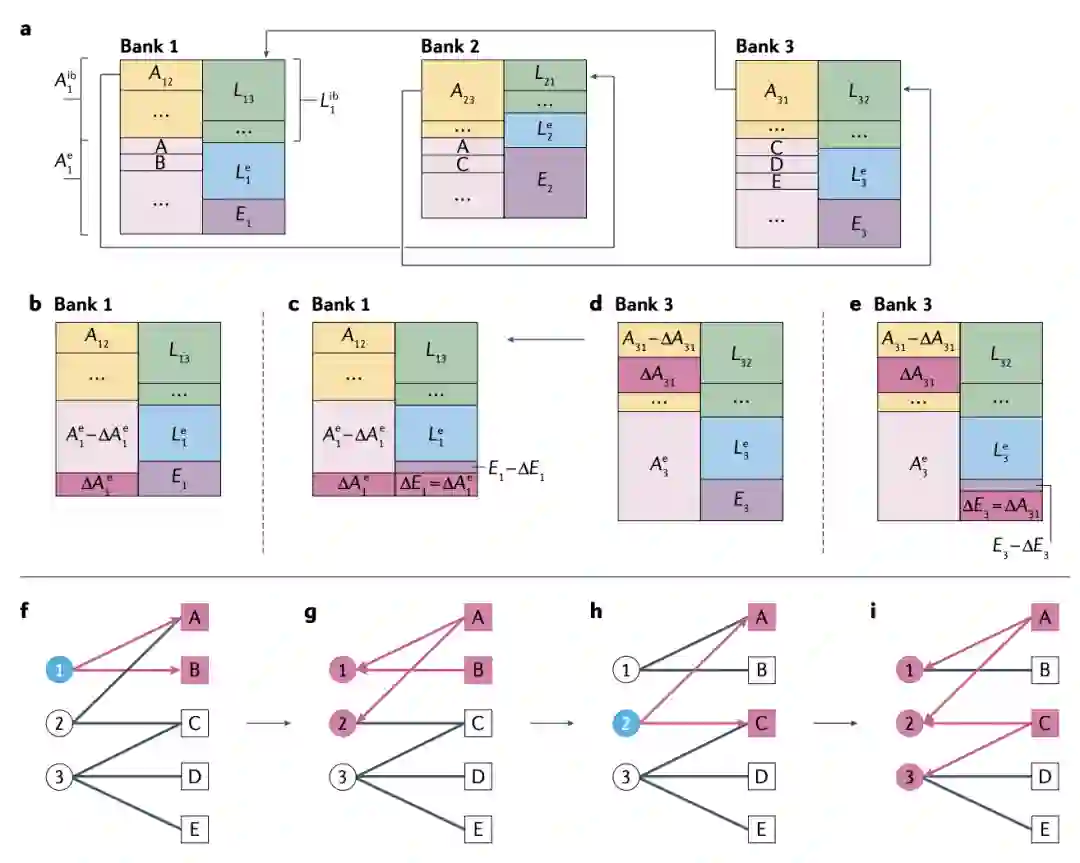 图 2. 银行间网络及其动态。一个由三家银行组成的程式化银行间网络,每家银行都用其资产负债表表示。资产方面是银行间资产,进一步分解为单个风险敞口,以及外部资产a。负债方面是银行间负债,同样被分解为外部负债和股权负债。b-e:通过银行间资产重估的偿付能力传染。外生冲击冲击银行1的外部资产(b部分),并被银行1的权益(c部分)吸收。由于银行3对银行1有风险敞口,它重新评估其银行间资产(part d)。具体的估值方法取决于具体的模型。最后,银行3的资产减少被其股本所吸收(第e部分)。f-i:重叠投资组合的传染。例如,银行1出售资产A和资产B,以实现其杠杆目标(第f部分)。这样做会导致A和B贬值。持有A和B的银行1和银行2的资产价值减少(第g部分)。因此,银行2现在需要去杠杆化并出售资产a和C(h部分)。这些资产折旧和银行1、2和3的资产价值减少(i部分)。