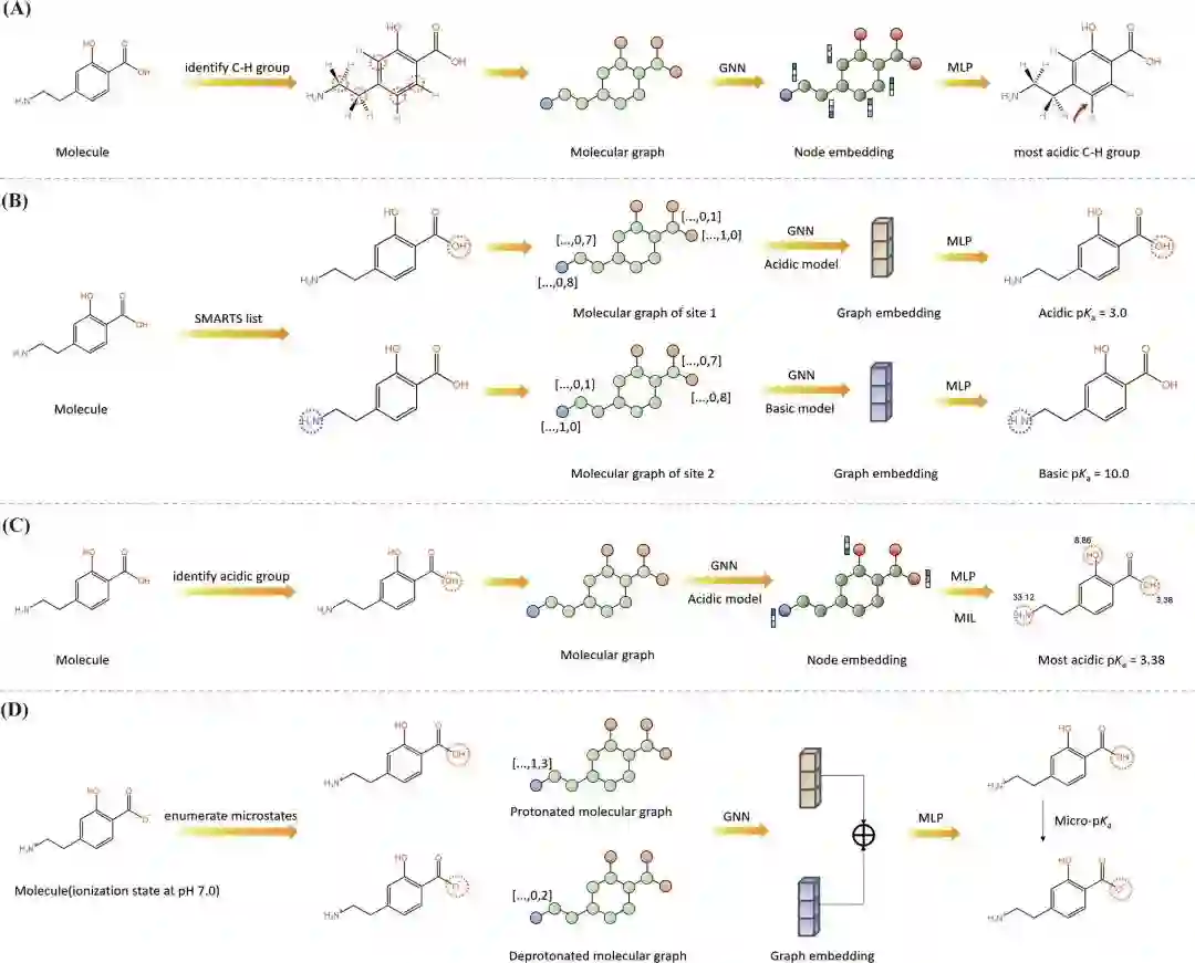基于描述符的模型以专家提取的固定维特征向量作为输入。相比之下,基于图的模型直接作用于由基本原子和键属性注释的分子图。这篇综述概述了基于ML的小分子pKa预测的最新进展,总结了计算预测工具,并讨论了当前的挑战和未来的方向。