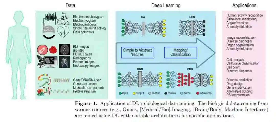 最近数据采集工具的技术进步使生命科学家能够从不同的生物应用领域获取多模式数据。大致分为三种类型(即序列,图像和信号),这些数据数量巨大且性质复杂。挖掘如此大量的数据用于模式识别是一项巨大的挑战,需要复杂的数据密集型机器学习技术。基于人工神经网络的学习系统以其模式识别能力而闻名,最近它们的深度架构-称为深度学习(DL)-已成功应用于解决许多复杂的模式识别问题。本文调研了DL在识别生物数据模式中的作用,提供了-DL在生物序列,图像和信号数据中的应用;这些数据的开放获取源的概述;适用于这些数据的开源DL工具的描述;并从定性和定量的角度比较这些工具。最后,它概述了挖掘生物数据的一些开放式研究挑战,并提出了一些可能的未来前景。