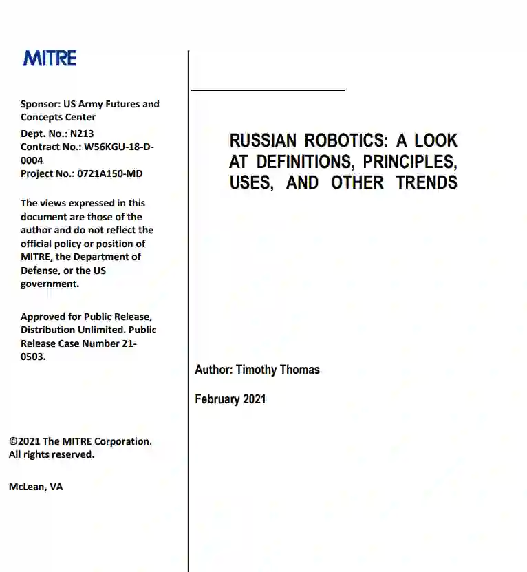 下面的摘要首先提供了俄罗斯理论家从1991年开始定义机器人的几种方式。第二,分析比较了俄罗斯和美国运用机器人的方法(从俄罗斯的角度),以及使用机器人的任务和原则。第三,详细介绍了机器人在俄罗斯的一些使用情况,重点是军事期刊上的描述--在城市环境中,与工程师支持相结合,在无人驾驶飞行器(UAV)的使用中,与火炮相结合,以及它们在叙利亚的使用。第四,研究了影响世界各地和俄罗斯的机器人使用的法律和组织问题的争议。第五,涵盖了俄罗斯在发展机器人能力中遇到的众多问题领域,随后是一些结论。有两个附录。附录一列出了一些机器人的使用原则,附录二提供了一些俄罗斯正在开发的机器人的照片以及它们的操作参数(还有一些照片中没有显示的)。