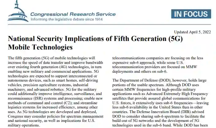 第五代(5G)的移动技术将增加数据传输的速度,并改善现有第四代(4G)技术的带宽,进而实现新的军事和商业应用。5G技术有望支持互联或自主设备,如智能家居、自动驾驶汽车、精准农业系统、工业机械和先进机器人技术。在军事领域,5G还可以改进情报、监视和侦察系统及处理;启用新的指挥与控制(C2)方法以及精简后勤系统,以提高效率等。随着5G技术的开发和部署,美国国会可能会考虑频谱管理和国家安全政策,以及对美国军事行动的影响。