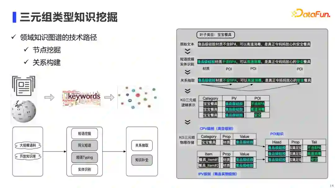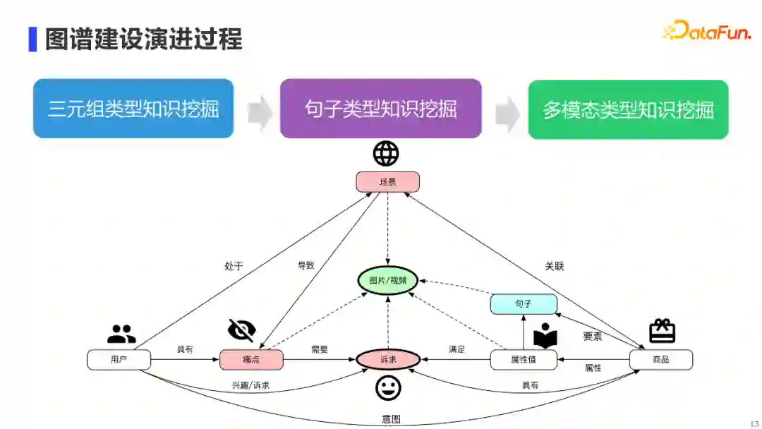 那么,直播场景下到底需要一个什么样的多模态知识图谱?我们可以先拆解一下主播是如何播报商品的。如右图所示,我们把主播讲解过程进行半结构化,可以看到,他们一般还是会遵循一定的套路。比如会先进行需求引导,也就是说用户一般在什么生活场景下,会遇到什么痛点,进而产生什么诉求,而我们的商品正好可以满足这个诉求。然后会对商品各方面进行详细介绍等。最后会提专属优惠、限时限量来引导下单。从这个流程中,我们就可以梳理出对图谱的结构化需求,如左图所示。概括来说,我们分为三大类: 第一类是三元组类型知识。主要需要“场景-痛点-诉求-商品”这样有逻辑性的知识,来对用户进行需求引导,也就是说他为什么要买这个商品。 第二类是句子类型知识。我们直播时需要对商品各方面进行详细介绍,而这种介绍需要句子粒度的信息,例如使用方法这个要素,需要有一段句子来进行介绍的。 第三类是多模态类型知识。在直播场景下,除了商品介绍,也需要有相应的商品和视频展示,从而提升数字人直播的表现力。 02