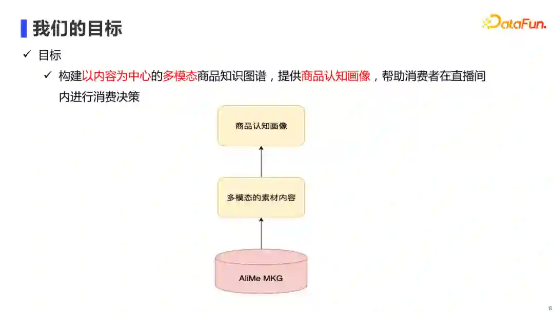 主要是在底层建设以内容为中心的多模态商品知识图谱AliMe MKG,进而可以提供多模态的商品素材内容,最终在上层构建出一个多模态商品认知画像,帮助消费者在直播场景下进行消费决策。 1. AliMe MKG的演进过程