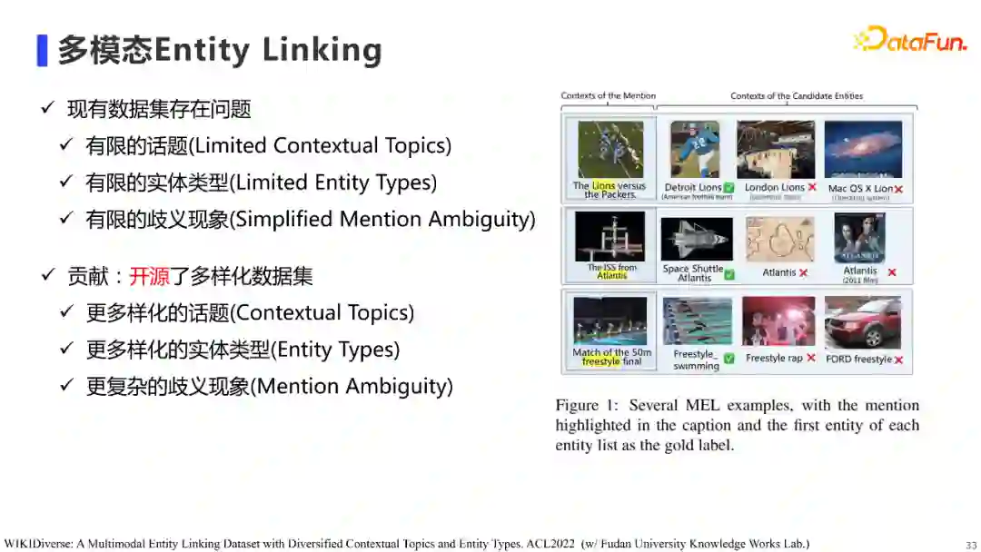 多模态Entity Linking是我们和复旦大学知识工场合作的一个工作,针对学界现有数据集存在的话题、实体类型及歧义现象较有限的情况,我们构建并开源了一个多样化的Entity Linking数据集,希望该数据集能有助于促进学界和工业界对Entity Linking工作的研究。