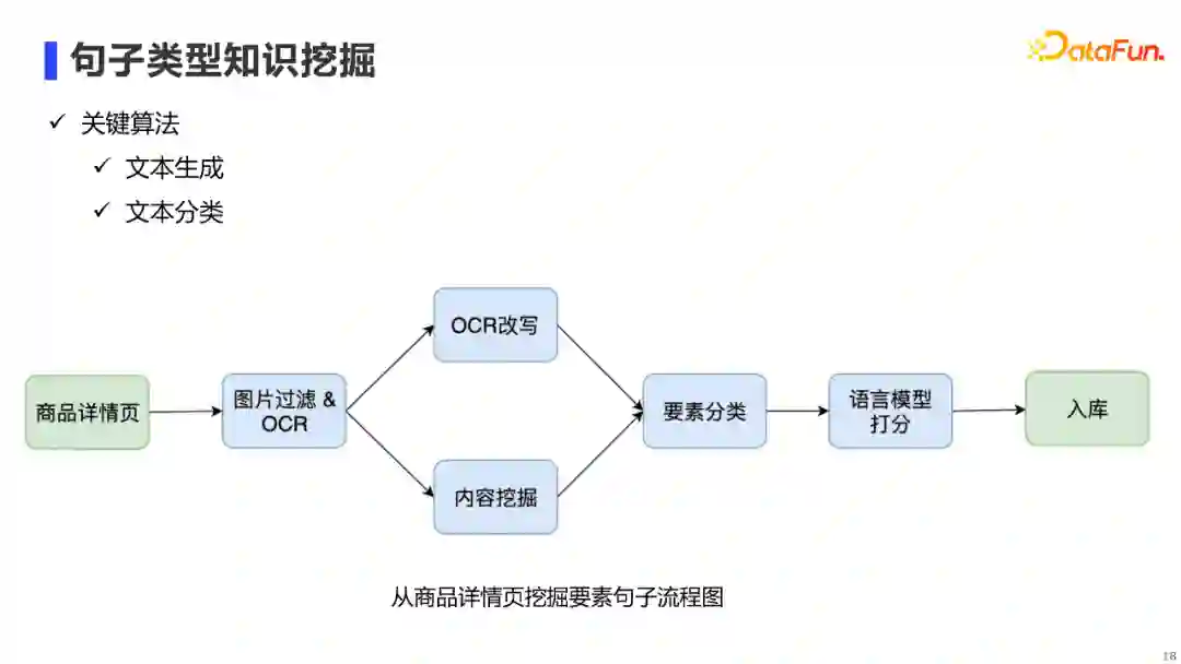 句子类型知识的挖掘还是比较复杂的,它需要从不同数据源中进行句子挖掘,以保证挖掘到的句子具有多样性。具体来说,我们主要会从三类数据源中进行句子挖掘: 第一类是阿里内部的商品微淘文章:我们一方面使用摘要算法,提取文章中描述的商品摘要;另一方面,我们也会针对文章中的句子,构建pipeline提取出能够描述商品属性的句子。 第二类是商品评论:我们主要使用极性分类器,提取商品的好评句子。 **第三类是商品详情页:**这里我详细展开说一下商品详情页的挖掘流程。
