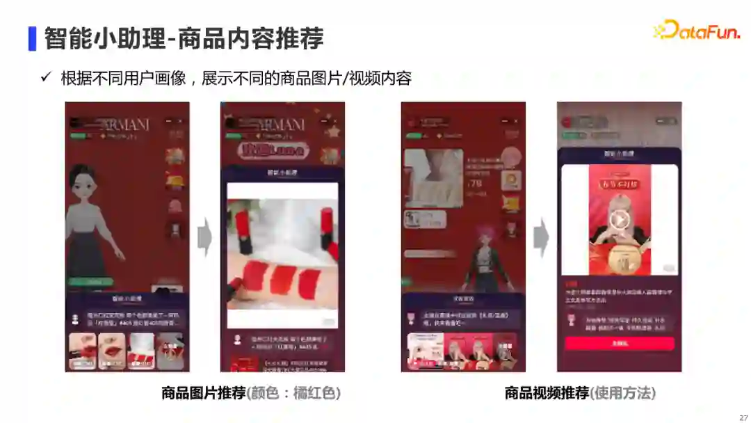 对于商品内容推荐的落地场景,我们主要考虑在直播间中,主播和听众之间是1vN的关系,即同一个主播在同一个时段内面对不同用户只能讲解同一种内容。然而,对于同一个时间段进入直播间的用户,他们的诉求可能是不尽相同,有人希望了解商品的用料材质,有人希望了解商品的使用方法。 因此,基于不同的用户画像,我们会为其推荐多模态图谱中不同的商品多模态内容,从而更好满足不同用户的诉求。 03